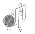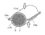 本発明において、ハニカム構造体1を圧縮弾性材料Bとともに圧縮状態で金属容器11内に入れる方法は、図3に示すガイド17を用いた押し込み方法、図4に示す金属板11cを巻き付けて引っ張ることで面圧を付与し、金属板11cの合わせ部を溶接して固定する巻き絞め方法、あるいは図5に示す2分割された金属容器11a,11bで負荷を与えながら挟み込み、2つの金属容器11a,11bの合わせ面(つば)16a,16bの個所を溶接することで一体化容器とするクラムシェル方法が好適である。また、この他に、図6に示すような、金属塑性加工技術を応用した、金属容器11を外部からタップ(加圧型)12を介して圧縮圧力を加えて金属容器11の外径寸法を絞る方法(スウェージング方法)も好適である。更には、図7に示すように、塑性加工を応用した方法で金属容器11を回転させながら加工治具18を用いて外周面を塑性加工により絞り込む方法、いわゆる回転鍛造方法によることで金属容器の外径を絞り、面圧を付与する方法も可能である。