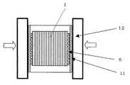 図2は図1に示すハニカム構造体を金属容器11に保持したハニカム構造体アッセンブリ8の平面−模式図である。図2に示す本発明のハニカム構造体アッセンブリ8は、ハニカム構造体1の外周に圧縮弾性材料Bを圧縮状態で配することによりハニカム構造体1を金属容器11に圧縮把持してなるものである。