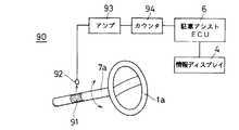 図1は、本発明の実施の第1形態としての駐車アシストシステムの概略的な構成を示す。本実施形態の駐車アシストシステムは、車両1の運転者が、ステアリング1aやシフトレバー1bを操作して、駐車場2で適切な位置に駐車することができるような支援を行う。駐車場2には、車両1の駐車用のスペースを、たとえば白線3などによって表示している。本実施形態の駐車アシストシステムでは、車両1が後進で駐車場2の所定の駐車スペースに駐車しようとするときに、情報ディスプレイ4に車両1の後方画像を表示し、また進行予測曲線5を合せて表示して運転者に対する支援を行う。情報ディスプレイ4に表示する画像は、車両1に搭載される電子制御ユニット(以下、「ECU」と略称することがある)の1つとしての駐車アシストECU6によって作成される。