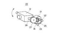 図7は、図6の方向変化機構の構成を示す。ケーシング11の下部19にはモータ21が取付けられる。モータ21の出力軸は、ケーシング11の底面にほぼ平行であり、ウォーム歯車22が取付けられる。ウォーム歯車22は下部19の底面から立設される支軸23に装着される平歯車24にモータ21の回転駆動力を伝達する。支軸23には、平歯車24ととともにウォーム歯車25が装着されており、平歯車24に伝達された回転駆動力は、ウォーム歯車25を回転させる。ウォーム歯車25は、ビデオカメラ12の撮像方向を角変位させる角変位軸26の一端に取付けられる平歯車27に回転駆動力を伝達する。角変位軸26は、ケーシング11の下部19の底面にほぼ平行であり、大略的に水平である。平歯車27が、モータ21からの回転駆動力で角変位することによって、ビデオカメラ12の撮像用レンズ13の光軸は、ほぼ水平な角変位軸26の軸線まわりに角変位する。