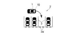 図2は、図1の駐車アシストシステムで車両1が後進しながら駐車場2の白線3で示される駐車スペースに進入しようとしている状態を示す。車両1の後部に取付けられているカメラユニット10は視野10a内の画像を撮像する。この視野10aは、車両1の運転者にとっては、死角となる部分を多く含む。駐車アシストECU6は、カメラユニット10からのNTSC方式の映像信号と、ステアリング角センサ7からのステアリング角の操作に対応するパルスと、シフト位置センサ8からのバックランプSW信号とに応答し、情報ディスプレイ4に対して車両1の進行予測曲線の表示と、クリアランスガイドとを行う。なお、カメラユニット10の撮像方向や撮像倍率が可変する構成の場合は、カメラユニット10の撮像方向(カメラユニット10の角度を検出する角度センサ出力)およびカメラユニット10の撮像倍率(カメラユニット10のレンズ位置を検出するセンサ出力)も進行予測曲線の表示のデータに用いられる。クリアランスガイドは、車両1の進行予測曲線に従って駐車するときに予想される駐車位置を表示し、白線3の画像との間にどの程度のクリアランスが生じるかを情報ディスプレイ4で確認可能にする。