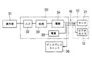 図8は、図5のカメラユニット10の撮像方向を変化させるための概略的な電気的構成を示す。カメラ制御部30は、操作部31から入力される指令に従って、モータ21の回転およびその方向を制御する。操作部31からの指令は、入力回路32に入力され、処理回路33によって指令の内容が解釈される。モータ21を駆動する指令であるときには、処理回路33は駆動回路34を制御して、電源35からの電力を、コード16を介してモータ21に供給し、モータ21を回転させる。ビデオカメラ24が撮像した画像は、ディスプレイユニット36の情報ディスプレイ4としての表示画面で画像として表示される。ディスプレイユニット36は、たとえば車両に搭載されるナビゲーション装置の地図データ表示や、テレビジョン放送の受像用と兼用して用いる。ディスプレイユニット36からカメラユニット10で撮像した画像を見ている操作者は、所望の画像が得られる状態でモータ21の駆動を停止し、撮像方向を一定に保持させる。本実施形態の方向変化機構20は、ウォーム歯車22,25を用いてモータ21からの回転駆動力の伝達を行わせているので、モータ21を停止させれば、ビデオカメラ12にかかる回転モーメントで逆方向に駆動力が伝達することはなく、ビデオカメラ12の撮像方向を保持することができる。