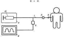 一般的薬液療法において、薬剤の収納された容器、例えば輸液バッグあるいは薬剤の充填された注射器より、輸液回路を介して患者の血管等に薬剤が投与される。この輸液療法において、図6に示すように薬剤投与と同時に患者の血圧を測定して監視する場合がある。すなわち、従来の輸液回路は、薬剤の充填された注射器41と、注射器41より薬剤を押し出すシリンジポンプ4(薬剤供給部)と、薬剤を移送するためのチューブ部材7と、その先端に設けられ、患者の血管等に穿刺し、薬剤を投与するための穿刺針9から構成されている。また、該輸液回路にはチューブ部材7の途中には、療法中に採血等が行うことが可能なように設けられた混注部8が設けられている。該輸液回路においては、薬液を人体に供給するチューブ部材7の途中より分岐した回路にトランスデューサー5が設けられ、輸液回路内の圧力を電気信号に変換し、圧力値表示手段6に出力するよう構成されている。これにより、医療従事者が投薬をしながら、圧力値表示手段6により患者の血圧を常時監視することができる。しかしながら、このような血圧測定システムでは、実際の使用時において、薬剤投与の際、チューブ部材内部の圧力がシリンジポンプ4の圧力の変動による影響を受けるから正確な圧力の監視ができないといった欠点があった。そこで、この欠点を解消するために該回路のトランスデューサー5とシリンジポンプ4の途中に流れ制御装置を設ける輸液回路が提案されている。例えば特開平1−171527号公報、あるいは特開平5−23308号公報では、流体用入口通路と出口通路とを有する共に、前記入口通路と出口通路とを夫々の通路より狭小な断面積を有する連絡通路を介して連通し、前記連絡通路の前記出口通路側端部に弾性体を配設して前記弾性体により前記出口通路側端部を閉塞し、入口通路から導入される流体が所定の圧力となる際に前記弾性体が押圧されて当該出口通路側端部が開成し、前記入口通路から出口通路へと流体が流通するよう構成したことを特徴とする流れ制御装置が開示されている。