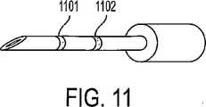 図11は、本発明の他の実施形態であって、針状ナイフにエッチング、刻印、又は、書込まれた線1101及び1102が露出した刃の様々な長さの指標になっている。ユーザが露出した刃の長さを判断できるものであれば、あらゆるタイプの目印が本発明の範囲に含まれることを当業者は理解するだろう。