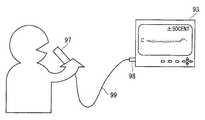 図19は、第3の使用形態を表す図である。マイク97により音声や楽器などの演奏の音を入力する。入力した信号はコード99を経由してジャック98を介して音楽練習支援機器93へ入力される。コード99の代わりに無線によって信号を伝えることも可能である。  FIG. 19 is a diagram illustrating a third usage pattern. Sound of performance such as voice and musical instrument is input by the