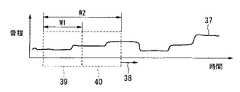 図5は、本発明の音程表示を表す図である。横軸に時間、縦軸に音程をとったグラフである。入力信号37は時間の経過に従い音程を変化させている。このような時間と音程の変化を第二データメモリ部15が記憶している。図中破線で囲っている第一表示エリア39は一画面に表示するデータを示している。W1の時間分を一画面に表示する。図中破線で囲っている第二表示エリア40は、W2の時間分を一画面に表示することを意味している。このようにどのくらいの時間分のデータを一画面に表示するかは表示方法設定部18で設定する。この設定によって表示部11では一画面に表示する時間を変えて表示する。一度に表示する時間が長くなれば、粗い表示となる。また、変化矢印38は移動のスピードを表している。単位時間当たり矢印の大きさだけスクロールすることを示している。このスクロールの速さも表示方法設定部18で設定する。この設定によって表示部11ではスクロールの速さを変えて表示する。  FIG. 5 is a diagram showing the pitch display of the present invention. It is a graph with time on the horizontal axis and pitch on the vertical axis. The