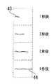 図7は、本発明のシングル表示モードを表す図である。シングル表示モードは一画面に表示されるデータ分の入力がされるとそこでストップするという表示モードである。この表示モードの場合に偏差の表示は画面の左端43から表示が開始される。表示は信号の入力と同時に行われる。1秒後、2秒後、3秒後、4秒後と画面は左から右へ音程線が表示される。4秒後、右端44で丁度一画面の表示が終了する。一画面の表示が終了すると入力が停止される。  FIG. 7 is a diagram showing a single display mode of the present invention. The single display mode is a display mode in which, when data corresponding to one screen is input, it stops there. In this display mode, the display of deviation starts from the