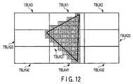 以下同様にして、信号処理部56−0〜56−31は、それぞれが描画処理するスタンプに貼り付けるべきテクセルを、ローカルメモリLM0〜LM31のいずれかから読み出し、スタンプに貼り付ける。その結果、図12に示される三角形の形状を有するテクスチャデータが、図7に示される三角形の形状を有するスタンプの集合に貼り付けられる。 Similarly, the signal processing units 56-0 to 56-31 read texels to be pasted on the stamps to be drawn from any of the local memories LM0 to LM31 and paste them on the stamps. As a result, the texture data having the triangular shape shown in FIG. 12 is pasted on the set of stamps having the triangular shape shown in FIG.