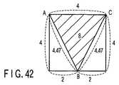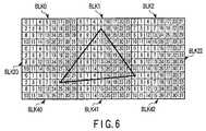 まず図形を描画するにあたって、まずラスタライザ55に図形情報が入力される(ステップS10)。図形情報は、例えば図形の頂点座標や色情報などである。ここで、例として三角形を描画する場合について説明する。ラスタライザ55に入力された三角形は、描画空間において、図6に示すような位置を占めるとする。すなわち、三角形の3つの頂点座標が、ブロックBLK1のスタンプS=7、ブロックBLK40のスタンプS=19、及びブロックBLK42のスタンプS=0に相当すると仮定する。  First, when drawing a graphic, graphic information is first input to the rasterizer 55 (step S10). The graphic information is, for example, the vertex coordinates or color information of the graphic. Here, a case where a triangle is drawn will be described as an example. It is assumed that the triangles input to the