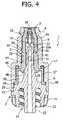 入口端4の内側面は、頭位円筒部7を有する。頭位円筒部7には、一連の軸方向チャネル8が形成されており、円錐台9の形状を有する部分へと、半曲している。中間部分5の内側面は、最終部分6に向かって、連続して、第1の円筒状部分10、円錐台形状を有する部分11、第2の円筒状部分12、円錐台形状を有する部分13、第3の円筒状部分14、円錐台形状を有する部分15、及び、拡大された終端部分6の内側に面し且つ環状に配置された正面軸方向突出部17に終端する、第4の円筒状部分16を、有している。この拡大された終端部分6の内側面には、径方向に突出し且つ環状に配置された軸方向突出部18が、形成され、その自由端によって、符号27で示される環状の肩部が画定されている。その機能については、後の説明で明らかにされる。  The inner side surface of the