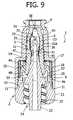 同時に、中空スパイク2の突出部33が、内側から、弾性ヘッド35と相互作用し始め、それは(図9、10)弾性的に変形された形状、すなわち径方向に外側に向かって拡張された形状を、取り始め、結果としてプレ・スリット38を開き始める。  At the same time, the