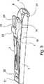 射出成形によって単一物として製造されたとき、解剖刀用脱刃具1は普通の状態で図4に示すような開放姿勢となる。使用に際して、図5に示すように、最初にフラップ27がフランジ13上に乗るまでアクチエータ3を折り畳む。そして、ネック部28がフランジ13間を通過するようにその端部の折り線から折り畳まれ、アクチエータがハウジング2内に押し込まれる。スロット10は、アクチエータがハウジング内に収容されうるようにラグ9に対応している。アクチエータ3が保持ラグ11、12を通過することによってパチンとフィットすると、この保持ラグ11、12がアクチエータをハウジング内に保持することとなり、図1に示すように使用準備が整う。組み立てに際し、アクチエータ3は基端位置、すなわち、ブレース7により近いところに位置している。ネック部28の二つ折り結合により、アクチエータはハウジング内で端部位置(すなわちブレースからより遠い位置)に向かって長手方向に移動しうる。 When manufactured as a single object by injection molding, the dissecting knife blade 1 is in an open state as shown in FIG. In use, as shown in FIG. 5, the