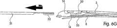 解剖刀が脱刃具内にさらに押し込まれると、図6Fに示すように、解剖刀がブリッジ24に当接してアクチエータをハウジング2の長手方向に沿って先端部に向けて押す。そうすると、脚部2 0を下方にそらせて刃33のかかと部をこみ32から離れるように積極的に持ち上げながら、アクチエータの脚部20上のカムフォロワ23が各カム面14に沿う。さらに、アクチエータが板ばね8を曲げつつディテント16上に乗る。