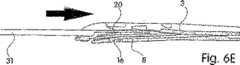 解剖刀30が脱刃具1内に押し込まれると、こみ32は(図6Eに示すように)ブリッジ24の下のトンネル25内を通過し、板ばね8を下方にそらせる。刃はその先端部がアクチエータによって下方にそらせられる(ラグ12によって押さえられる)ので、わずかにアーチ状となる。刃のかかと部分(heel)がブレース7を乗り越えるとき、脚部20の案内部が刃33のかかと部34をこみ32から離れるように下方にそらせる。 When the dissecting