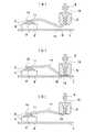 本発明のワイヤボンディング方法の第2の実施の形態を図4乃至図6により説明する。本実施の形態は、前記実施の形態と図1(a)から図2(a)までは同じである。図4(a)は図2(a)の状態を示す。前記実施の形態は、図2(a)の工程後、直線状ワイヤ部18の端部19をキャピラリ5により直接第2ボンド点Bにボンディングした。本実施の形態は、図4(a)(図2(a))の工程後、直線状ワイヤ部18の端部19をキャピラリ5により直接第2ボンド点Bにボンディングしない。  A second embodiment of the wire bonding method of the present invention will be described with reference to FIGS. The present embodiment is the same as the previous embodiment from FIG. 1A to FIG. 2A. FIG. 4A shows the state of FIG. In the embodiment, after the step of FIG. 2A, the