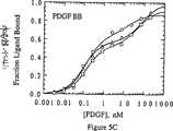 図5A、5Bおよび5Cは、それぞれPDGF−AA、ABおよびBBに対する最小の高親和性DNAリガンドの結合を示す。種々の濃度のPDGFに結合した32P5’末端標識DNAリガンドの画分は、ニトロセルロースフィルター結合法により測定した。試験した最小リガンドは、20t(○)、36t(△)、および41t(■)であった。これらの実験のオリゴヌクレオチド濃度は、〜10pM(PDGF−ABとPDGF−BB)および〜50pM(PDGF−AA)であった。非線形最小自乗法を用いて、データ測定点を式1(PDGF−AAへのDNAリガンドの結合に関して)または式2(PDGF−ABおよびBBへの結合に関して)に適合させた。結合反応は、結合緩衝液(0.01%HSAを含むPBSM)中で37℃で行った。
