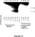 図11は、PC−3細胞からの原形質膜抽出物による電気泳動移動度のシフトを示す。レーン1〜8において、膜抽出物は、各レーンの下に示される種々の濃度の放射標識hKGFと反応させた。レーン9〜12については放射標識hKGFに加えて(各レーンの下に示されるように)100倍モル濃度過剰の非標識hKGFを加えた。C1およびC2は、PC−3原形質膜抽出物中のhKGF結合残基の存在による2つの観察された複合体を表す。