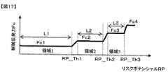 図16に示すように、リスクポテンシャルRPが領域1にある場合、制御反発力Fc=Fc1とする。領域1におけるリスクポテンシャルRPの範囲は、0≦RP<RP_Th1であり、フラット領域の範囲(長さ)Lは、L1である。領域2および領域3のフラット領域の長さLは、それぞれL2,L3である。領域1〜3のフラット領域の長さLがK1=L2=L3となるように、リスクポテンシャルRPの所定値RP_Th2、RP_Th3および制御反発力Fcの変化率ΔFc12、ΔFc23を設定する。なお、RP_Th2<RP_Th3、ΔFc12<ΔFc23である。  As shown in FIG. 16, when the risk potential RP is in the