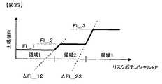 図16に、リスクポテンシャルRPが増加していく場合の、リスクポテンシャルRPに対する制御反発力Fcの変化を示す。なお、図16には、リスクポテンシャルRPについて4つの領域を設定した場合を例として示している。ただし、最もリスクポテンシャルRPが大きい領域4を除く領域1〜3において、フラット領域の範囲を略同一にしている。  FIG. 16 shows the change in the control repulsive force Fc with respect to the risk potential RP when the risk potential RP increases. FIG. 16 shows an example in which four regions are set for the risk potential RP. However, in the