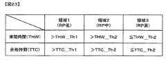 車間時間THWは、車間距離Dを自車速Vhで除したものであり、先行車の現在位置に自車両が到達するまでの時間を表す。この車間時間THWが大きいほど、周囲の環境変化に対する予測影響度合が小さくなる。つまり、車間時間THWが大きい場合には、もしも将来に先行車の車速が変化しても、先行車までの接近度合には大きな影響を与えず、余裕時間TTCはあまり大きく変化しないことを示す。なお、自車両が先行車に追従し、自車速=先行車速である場合は、(式4)において自車速Vhの代わりに先行車速を用いて車間時間THWを算出することもできる。 The inter-vehicle time THW is obtained by dividing the inter-vehicle distance D by the own vehicle speed Vh, and represents the time until the own vehicle reaches the current position of the preceding vehicle. The greater the inter-vehicle time THW, the smaller the predicted influence level with respect to the surrounding environmental changes. That is, when the inter-vehicle time THW is large, even if the vehicle speed of the preceding vehicle changes in the future, the degree of approach to the preceding vehicle is not greatly affected, and the margin time TTC does not change so much. When the own vehicle follows the preceding vehicle and the own vehicle speed = the preceding vehicle speed, the inter-vehicle time THW can be calculated using the preceding vehicle speed instead of the own vehicle speed Vh in (Equation 4).