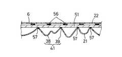 図4,5,6は、この発明の実施態様の一例を示す図2と同様な図と、同図のV−V線切断面と、VI−VI線切断面とを示す図である。このおむつ1の前胴周り被覆域6と後胴周り被覆域7とは、同じ構造のもので、外面シート21と内面シート22とを有する。外面シート21と内面シート22とは、胴周り方向へ弾性的に伸長可能な不織布からなり、外面シート21は胴周り方向において山38と谷39とを繰り返す複数のひだ41を有する一方、内面シート22は胴周り方向へ平滑に延びている。胴周り開口16を形成する前後胴周り被覆域6,7の縁部26,27では、複数条の胴周り弾性部材28が外面シート21と内面シート22との間において胴周り方向へ延び、非伸長状態または伸長状態で内面シート22に接合している。また、前胴周り被覆域6では、縁部26とこれに平行していて脚周り開口17の一部分を形成する縁部52との中間域において、一条または複数条の胴周り方向へ弾性的に伸長可能な帯状片からなるスペーサ51が外面シート21と内面シート22との間にあって胴周り方向へ延び、接着剤56を介して内面シート22に対して非伸長状態で接合している。後胴周り被覆域7では、前胴周り被覆域6と同様に、縁部27とこれに平行していて脚周り開口17の一部分を形成する縁部53との中間域において、一条または複数条の胴周り方向へ弾性的に伸長可能な帯状片からなるスペーサ51が外面シート21と内面シート22との間にあって胴周り方向へ延び、接着剤56を介して内面シート22に対して非伸長状態で接合している。外面シート21は、接着剤57を介して胴周り方向において間欠的に個々のスペーサ51に接合する他に、内面シート22にも接合している。  4, 5, and 6 are views similar to FIG. 2 showing an example of the embodiment of the present invention, and a V-V line cut surface and a VI-VI line cut surface of FIG. The front