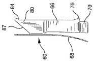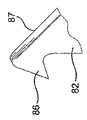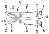 この実施形態では、第2の一対の脚部がV型本体部分61から末端側に延在している。これらの一方の脚部80第1の壁62から延在し、他方の脚部82は第2の壁64から延在している。脚部80および82は、好ましくは、それぞれ、棘84および86を含む。棘84、86は、脚部80、82の末端から基端側に延在している。棘は、末端側に延在している脚部の外側縁上に形成されている。各々の脚部は更に、ストッパ44を貫通可能なカッティングエッジ87を含む。ここで使われるカッティングエッジまたはカッタという用語は、カッティングエッジおよび/または尖鋭な突起、またはその他ストッパを切開または穿孔可能な構造を含むことを意図するものである。  In this embodiment, the second pair of leg portions extends from the V-shaped