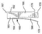 図17および図18は、本発明の他の実施形態であるロックエレメント160を例示する。ロックエレメント160は、図1〜図16の実施例のロックエレメント60と同様に機能する。ロックエレメント160はV型の本体部分161を含み、この本体部分は長手方向軸に沿ってつながる第1および第2の放射状延在壁162および164を具えている。第1の脚部166が第1の壁基端側に延在し、そして第2の脚部168が第2の壁から基端側に延在している。脚部は、図18で示すようにV型の本体部分に関して外方に広がっている。脚部166および168の各々は、基端部170および172を含み、それらはプランジャロッドアセンブリの放射状延在壁のうちの1枚に向けて曲げられている。棘176および178は、第1および第2の脚部と一体となっている。棘は基端側に向いており、注射器外筒の内側表面と係合することができるものである限り、図中に例示されるものと異なる外観を有していても良い。カッタすなわちカッティングエッジ187は、ロックエレメント160の末端部に配置される。図1〜図16の実施形態と同様に、プランジャロッドアセンブリを交代させるために通常でない力が用いられると、ロックエレメントの末端部のカッティングエッジ187はストッパを貫通し、それを使えなくする。ロックエレメントは、望ましくは金属薄板でつくられる。ロックエレメントは、図17で例示される平らな形状に予め形成される。点線は図18に示されるロックエレメント160を形づくるための、平らな基材188に作られる折り目を示している。  17 and 18 illustrate a