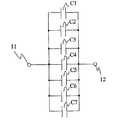 以上の可変容量素子C1〜C7と、バイアスライン31,32と、薄膜抵抗61〜66とで構成される可変容量薄膜キャパシタの回路図を、図6に示す。この回路構成に示されるとおり、入力端子11と出力端子12との間に、印加電圧値によって容量が変化する可変容量素子C1〜C7が順次直列接続され、前記入力端子11と、偶数番目の可変容量素子とその次の奇数番目の可変容量素子との接続点の間に、それぞれ薄膜抵抗61〜63が設けられ、前記出力端子12と、偶数番目の可変容量素子とその前の奇数番目の可変容量素子との接続点の間に、それぞれ薄膜抵抗64〜66が設けられている構成になる。なお、図6の回路構成は、簡単のため、補助導体ライン33,34,35を省略している。  FIG. 6 shows a circuit diagram of a variable capacitance thin film capacitor including the variable capacitance elements C1 to C7, the bias lines 31 and 32, and the