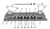 以下、薄膜誘電体層4、上部電極層5及び可変容量素子C1〜C7の、高周波信号伝搬方向Pに沿って配列された順番を番号「j」(jは自然数)であらわすことがある。  Hereinafter, the order in which the thin