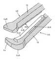 図7は、本発明の第3の実施の形態の内視鏡用鋏型高周波切開具の先端部分の斜視図であり、各高周波電極6A,6Bの先端領域6aA,6aBの幅と絶縁突起6xの幅を、それより後方の各高周波電極6A,6Bの幅より幅広に形成したものである。その他の構成は前記の第1の実施の形態と同様である。このように構成することにより、第1の実施の形態と同様の効果に加えて、切開済みの粘膜が切開部に覆いかぶさるのを各先端領域6aA,6aBの幅広部で押し退けて、切開部を内視鏡観察し易い状態で粘膜下層剥離術を行うことができる効果がある。  FIG. 7 is a perspective view of the distal end portion of the scissors-type high-frequency incision tool for an endoscope according to the third embodiment of the present invention. The widths of the distal end regions 6aA and 6aB of the respective high-