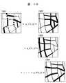 図10はこの演算の具体的な作用を示した道路ネットワークの模式図であり、太い線分は渋滞しているリンクを、細い線分は空いているリンクを表す。上述のように基底ベクトルは渋滞のパターンを表しており、図10では1302,1303,1304が基底ベクトルに相当する。一方、1301は時刻t_cにおける実際の交通状況に相当する交通状況ベクトルであって、実線のリンクは所要時間が観測されたリンク、点線のリンクは所要時間が不明なリンクを表している。数式1の演算では、1301で実線で示された所要時間の観測値に基づいて、基底ベクトル(1302,1303,1304)の線形合成における係数a_1(t_c),a_2(t_c),…,a_P(t_c)を求める作用を持つ。図10で、時刻t_cにおける交通状況ベクトル(1301)を、基底ベクトル(1302,1303,1304)の線形合成で表す際の係数a_1(t_c),a_2(t_c),…,a_P(t_c)を要素としたベクトルa(t_c)が特徴空間における射影点の座標ベクトルであり、このa(t_c)の各要素は基底ベクトル1〜Pに沿った座標軸上の座標値である。  FIG. 10 is a schematic diagram of a road network showing a specific operation of this calculation. A thick line segment represents a congested link, and a thin line segment represents an open link. As described above, the basis vectors represent a traffic jam pattern, and 1302, 1303, and 1304 correspond to the basis vectors in FIG. On the other hand, 1301 is a traffic condition vector corresponding to the actual traffic condition at time t_c. The solid line link indicates the link whose required time is observed, and the dotted line link indicates the link whose required time is unknown. In the calculation of
