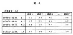 射影点軌跡生成部104は、特徴空間射影部103と同様に数式1による演算処理によって、所要時間テーブルに蓄積されている交通状況ベクトルを、基底DB109に格納された基底ベクトルに基づいて特徴空間に射影し、それぞれの射影点を求める。ただし、特徴空間射影部103の演算対象が現在時刻の交通状況ベクトルであるのに対して、射影点軌跡生成部104は、所要時間DB101の所要時間テーブルに含まれる過去の所要時間の情報である交通状況ベクトルを射影し、その時刻インデックスt_1〜t_Nに対応した過去の射影点a(t_1)〜a(t_N)を生成して、射影点DB105に時刻順に記録する。この時刻順に記録された射影点を射影点軌跡とする。射影点DB105のデータ構造は、図4のように、所要時間テーブルに対応した時刻t_1〜t_Nと、基底ベクトル1〜Pをインデックスとし、それぞれの基底ベクトルに対応した係数を値とするテーブルであり、時刻t_mにおける基底ベクトルiの値が、射影点a(t_m)の基底ベクトルiに対応した係数a_i(t_m)となる。このテーブルを射影点テーブルとする。  Similar to the feature