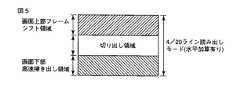 図5は、高速にAF処理を実行するために使用される一部切り出し駆動の概念を示す図である。一部切り出し駆動では、AF時のフォーカスエリアにかかるライン(切り出し領域)の画素データのみを、例えば4/20ライン読み出しモード(水平加算有り)によりCCD12から取り出す。切り出し領域より画面下部の領域については高速掃き出し、切り出し領域より画面上部の領域についてはフレームシフトにより電荷を基盤へ掃き出してしまう駆動を行う。このため、CCD12より出力されるデータはフォーカスエリアのラインのみとすることがきるため、120fps以上の高速転送(第2の転送時間による転送)を実現することができ、AF処理を高速に行うことが可能となる。  FIG. 5 is a diagram showing the concept of partial cut-out driving used for executing AF processing at high speed. In the partial cutout drive, only the pixel data of the line (cutout region) applied to the focus area at the time of AF is taken out from the
