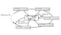 図3に示すように、プラットフォームの機能の一部として形成されたスケジューラ(制御用ソフトウェア起動管理手段の機能の一部をなす)によって、複数のアプリケーション1,2‥nの実行タスクは、予め定められた時系列順序にて周期的に起動管理される。あるアプリケーションの実行タスクが到来し、かつ、対応する機能への動作要求が外部から入力されている場合は、そのアプリケーションは起動されることになるし、動作要求が入力されていなければそのアプリケーションの実行タスクはスキップされる。そして、各アプリケーションは、対応する機能への動作要求が入力されない状態で一定時間経過すれば、上記のスリープ状態に移行可能となる。ここで、敢えて移行「可能」と記載したのは、他のソフトウェアに係る機能への動作要求入力が存在する場合は、CPU3全体をスリープモードに移行させることができないからである。  As shown in FIG. 3, execution tasks of a plurality of