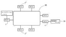 以下、図1の制御対象機器がカーナビゲーションシステムであり、そのカーナビゲーションシステムの機能制御用アプリケーションをバージョンアップのために更新する場合を例にとり、より詳細に説明するが、本発明はもちろんこれに限定されるものではない。図2において、ECU1で使用するアプリケーションの更新バージョンプログラムが、ECU1’に接続された無線通信ユニット31により受信されたとする。この更新バージョンプログラムの受信は種々の形態で行なうことができる。例えば、定期バージョンアップのように、サーバーからの更新バージョンプログラムの配信時刻が決まっており、その時刻に合せて更新バージョンプログラムをECU1’が一方的に配信されてくる場合は、その更新バージョンプログラムを無線通信ユニット31にて自発的に受信すればよい。また、ユーザー側の希望により更新バージョンプログラムをダウンロードして取得する場合は、無線通信ユニット31からサーバーに更新バージョンプログラムの配信要求を無線送信し、これを受けてサーバーから送られてくる更新バージョンプログラムを無線通信ユニット31で受ける方式も可能であるし、ユーザーが携帯電話端末から配信要求を無線送信し、その携帯電話端末にて更新バージョンプログラムを受けた後、Blue Toothなどの近距離無線により無線通信ユニット31へ転送する方式を採用してもよい。いずれの場合も受信した更新バージョンプログラムは、ECU1’内の固定記憶部(例えばフラッシュROM)内にダウンロードされる。図2において、ECU1’はECU1にシリアル通信バス30を介して更新バージョンプログラムの受信を通知する。  In the following, the device to be controlled in FIG. 1 is a car navigation system, and the function control application of the car navigation system is updated for version upgrade as an example. It is not limited. In FIG. 2, it is assumed that an update version program of an application used in the ECU 1 is received by the