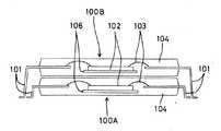 ところで、図6および図7には、上記のような従来の工法により製造された積層パッケージを示した。図6に示すものは、樹脂でモールドされたパッケージを積層したものである。また、図7は、図6のモジュール基板の平面図である。このICパッケージ100A、100Bには、IC実装部106と、その上面に実装されたICチップ102と、ICチップ102と外部部品とを接続するリード101と、ICチップ102とリード101とを樹脂内部で接続するボンディングワイヤ103とが設けられている。また、ICチップ102を含む所定の領域は、樹脂体104により被覆されている。