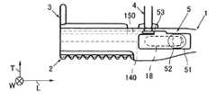 図5乃至図8の本体部材1は、前端部101に、第1の収納部14と、第2の収納部15とを有している。第1の収納部14は、高さ方向Tでみた前端部101の下側を長手方向Lに沿って伸びており、刃部材2が着脱可能に取り付けられている。第1の収納部14は、収納空間140と、収納空間140に通じる開口端141とを有している。  The