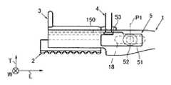 さらに図11に示すように、操作ボタン52を、貫通孔18の中央付近から他端側のポイントP2までスライドさせた場合、段状部53の上段が指置き部材4を長手方向Lに強制的に移動させ、指置き部材4によって押された突起部材3が、前端部101の先端から押し出される。この状態で突起部材3を指でつまむことにより、収納空間150から突起部材3を抜き出すことができる。図11からは必ずしも明らかではないが、突起部材3を抜き出した後、さらに指置き部材4を収納空間150から抜き出される。  Further, as shown in FIG. 11, when the