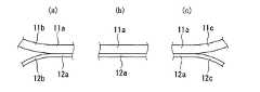 この大流路11と小流路12との関係を図2および図3を用いてさらに詳しく説明する。図2(a)は大流路11および小流路12の各々の導入部11b、12bと集合部11a、集合部12aとの境界近傍の部分拡大平面図である。また、図2(b)は大流路11および小流路12の各々の集合部11a、集合部12aの部分拡大平面図である。また、図2(c)は大流路11および小流路12の各々の集合部11a、集合部12aと流出部11c、12cとの境界近傍の部分拡大平面図である。さらに、図3は、大流路11および小流路12の各々の集合部11a、集合部12aにおける拡大断面図である。  The relationship between the
