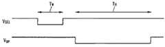 同図においては、有機エレクトロルミネッセンス素子を有する画素回路1−1に対応してスイッチ20−1が設けられ、画素回路1−2に対応してスイッチ20−2が設けられていることになる。つまり、各画素それぞれに対して前述したスイッチを設けているのである。そして、これらスイッチは、制御信号S1,S2で切換え制御する。この制御信号は、各画素回路内のキャパシタを充電している期間及び有機エレクトロルミネッセンス素子を発光させている期間を除く期間に入力し、各スイッチを切換え制御する。例えば前述した図4の実施例を例に取れば、この制御信号Sは、書込期間TWを定める選択電圧VSEL及び表示期間THを定めるデータ保持制御信号Vgpを参照して容易に生成することができる。すなわち、図6(a)に示されているように、選択電圧VSELによる書込期間TW及びデータ保持制御信号Vgpによる表示期間TH以外の期間を逆バイアス期間TBとすることになる。In the figure, a switch 20-1 is provided corresponding to the pixel circuit 1-1 having an organic electroluminescence element, and a switch 20-2 is provided corresponding to the pixel circuit 1-2. That is, the above-described switch is provided for each pixel. These switches are switched by control signals S1 and S2. This control signal is input during a period excluding the period during which the capacitors in each pixel circuit are charged and the period during which the organic electroluminescence element is caused to emit light, and switches and controls each switch. For example, taking the above-described embodiment of FIG. 4 as an example, the control signal S can be easily obtained by referring to the selection voltage VSEL that defines the writing period TW and the data holding control signal Vgp that defines the display period TH. Can be generated. That is, as shown in FIG. 6 (a), to a period other than the display period TH by the write period TW and the data holding control signal Vgp by the selection voltage VSEL reverse bias period TB Become.