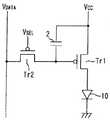 <1> Reverse Bias Application in Circuit of FIG. 9 FIG. 2 is a circuit diagram showing an embodiment of a drive circuit of an active matrix display device using an organic electroluminescence element according to the present invention. As shown in FIG. 2, the organic electroluminescence element driving circuit of this example is for switching the cathode side of the organic electroluminescence element from the second potential (GND) to the first potential (VCC ). A