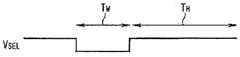 図9の回路に関する簡単なタイミングチャートが図10に示されている。図10に示されているように、データ書込みを行う場合には、選択電位VSELをローレベルにすることによって、トランジスタTr2をオン状態にして、容量素子2を充電する。この充電期間が同図中の書込期間TWである。この書込期間TWの後、実際に表示を行う期間となる。この期間においては、容量素子2に蓄積された電荷によりトランジスタTr1の導通状態が制御される。この期間が同図中の表示期間THである。A simple timing chart for the circuit of FIG. 9 is shown in FIG. As shown in FIG. 10, when data writing is performed, the transistor Tr2 is turned on by setting the selection potentialVSEL to a low level, and the capacitor element 2 is charged. This charging period is the writing periodTW in FIG. After this writing period TW , it is a period for actual display. During this period, the conduction state of the transistor Tr1 is controlled by the charge accumulated in the capacitor 2. This period is a display period TH in FIG.
