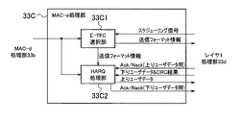 また、E-TFC選択部33c1は、決定した送信フォーマットについての送信フォーマット情報(送信データブロックサイズや、エンハンスト個別物理データチャネル(E-DPDCH)と個別物理制御チャネル(DPCCH)との送信電力比等)をレイヤ1処理部33dに送信すると共に、決定した送信フォーマット情報を、HARQ処理部33c2に送信する。  The E-TFC selection unit 33c1 also transmits transmission format information (transmission data block size, transmission power ratio between the enhanced dedicated physical data channel (E-DPDCH) and the dedicated physical control channel (DPCCH), etc.) for the determined transmission format. ) Is transmitted to the layer 1