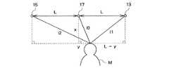 プレイヤ姿勢判定部212は、超音波発信器17、超音波受信器13,15を用いて、ゲームステージ20上に立つプレイヤの姿勢を判定する。すなわち、図8に示すように、超音波発信器17から超音波を発射し、プレイヤMの頭を反射して超音波受信器13,15に入射するまでの各時間を計測し、そこから超音波発信器17からプレイヤMの頭に至る距離l0とプレイヤMの頭から超音波受信器13に至る距離l1との和(l0+l1)、及び超音波発信器17からプレイヤMの頭に至る距離l0とプレイヤMの頭から超音波受信器15に至る距離l2との和(l0+l2)を取得する。さらに、図中Lの長さは既知であるから、これらの情報を元に、プレイヤMの頭の位置を特定するデータ(x及びy)を算出する。そして、yの値(プレイヤの頭の左右のシフト量)の絶対値が所定値以上の状態が所定時間以上継続する場合には、基礎位置設定部216にプレイヤの頭のずれ方向を通知する。これを受けて、基礎位置設定部216は配置基準位置の再選択を行う。  The player