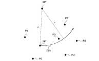図10は、配置基準位置の再選択の方法を説明する図である。同図に示すように仮想3次元空間に基礎位置P1〜P6が配置されている場合、プレイヤキャラクタオブジェクトの現在位置SP’を通り、指向位置に配置された相手プレイヤキャラクタオブジェクト(相手オブジェクト)の位置を中心とする軌道250を算出する。この軌道250は、プレイヤの頭が筐体12に向かって左側にずれているとき平面視で反時計回りに延びる。また、右側にずれているとき平面視で時計回りに延びる。そして、軌道250に最も近い基礎位置(ここではP3)を新しい配置基準位置に選出する。  FIG. 10 is a diagram for explaining a method for reselecting the arrangement reference position. As shown in the figure, when the base positions P1 to P6 are arranged in the virtual three-dimensional space, the position of the opponent player character object (the opponent object) arranged at the pointing position through the current position SP ′ of the player character object. Is calculated. The