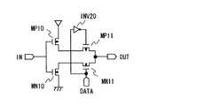 セレクタ1セルの回路詳細を図12に示す。図12に示されるように入力INは、PチャネルMOSトランジスタMP10のゲート及びNチャネルMOSトランジスタMN10のゲートに入力される。このPチャネルMOSトランジスタMP10のソースは電源端子に接続されている。また、NチャネルMOSトランジスタMN10のソースは接地端子に接続されている。PチャネルMOSトランジスタMP10のドレインは、PチャネルMOSトランジスタMP11のドレインに接続されている。PチャネルMOSトランジスタMP11のゲートには、AをインバータINV20により反転させた信号が入力される。NチャネルMOSトランジスタMN10のドレインは、ゲートに信号がAが入力されるNチャネルMOSトランジスタMN11のソースに接続されている。PチャネルMOSトランジスタMP11のドレイン及びNチャネルMOSトランジスタMN11のソースは、出力端子OUTに接続されている。すなわち、AおよびAをインバータINV20により反転させた信号がスイッチの役割を果たし、入力端子INに入力された信号が出力端子OUTに出力されるか、出力端子OUTの出力がハイ・インピーダンスになるかを選択している。  The circuit details of the