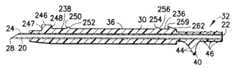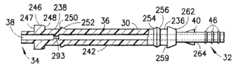 特に好ましい実施態様として、ハブ30の外面36及び外側シールド部材50の内面60には、これら外面36と内面60との間を所定の様態で協働する軸方向の動きが与えられるよう複数の対応する溝と斜面とが形成されている。例えば、図2から図6に示す通り、ハブ30の外面35には、比較的大径の前肩部246が設けられている。前肩部246は、前面(当接面)247と後当接面248とを備えて形成されている。前肩部246の直後ろには、その一面が後当接面248となり、もう一方の面が傾斜面252の端面(後当接面)250となる第1の溝238が設けられている。傾斜面252は、前肩部246より小さな径を有し、第1の溝238から下向きに傾斜している。傾斜面252は、ハブ30の外面36によって形成される長い谷部242で終端が形成されている。谷部242は、第1の溝238と実質的に等しく、比較的一定の径を有している。谷部242は、ハブ30の先端部34から離れ、基端部32に向かうにつれて、その径が増加する傾斜面254で終端が形成されている。傾斜面254は第2の溝236に向けて下向きに傾斜する傾斜面256へと続いている。第2の溝236は、谷部242の径よりわずかに大きい径に形成され、後当接面259で終端が形成されている。後当接面259は、後傾斜面262の終面でもあり、この後傾斜面262は、ハブ30の基端部32に沿って延びる延長部264で終端が形成されている。第1タブ40及びリブ46は、ハブ30の基端部32に沿って延びる延長部264において、ハブ30から延びている。