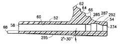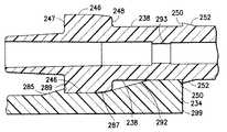 ハウジング52の内面60は、ハブ30の前肩部246の外径より僅かに大きい。基端部54に向かうにつれて、ハウジング52の内面には2つの傾斜面285、292が形成される。必要に応じて、傾斜面285の代わりに傾斜のない突起を設けてもよい。拡大図面である図9に詳細に示すとおり、傾斜面285によって、ハウジング52は、外側シールド部材50の基端部54に向かうにつれて、その内径が減少する。傾斜面285は当接面289で終端部が形成され、ここから、ハブ30の肩部246の外径に略等しい内径を有する平面287へと続く。平面287は、同じく、外側シールド部材50の基端部54に向かうにつれて、その内径が減少する傾斜面292で終端部が形成されている。傾斜面292の端部の内径は、傾斜面285の内径より実質的に小さい。外側シールド部材50の内面60は、ハウジング52の基端部54に後面299が設けられた状態で、前肩部246の径より実質小さい径の平らな突起234で終端が形成される。
