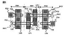 図7および図8に実施例4のSRAMセルのレイアウトMC3を示す。図7および図8で使用される記号の説明を図3に示した。実施例4のメモリセルMC3は実施例3のメモリセルMC2と比べて、多結晶シリコン配線層(FG5、FG6、FG7、FG8)の形が長方形である点が異なる。このセルでは、折れ曲がりがなく、パターン補正(OCP)が必要なく、トランジスタどうしのバランスがよくなる。