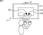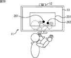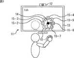そして、図5に示すように、表示部13において、鏡面処理後の撮像画像が、1チャンネルのテレビジョン番組の画像が表示された視聴対象画面上に、半透明で表示されるとともに、特徴点に基づいて特徴点ポインタ14とUI15が表示される。これにより、ユーザは、視聴対象である1チャンネルのテレビジョン番組の画像、カメラ12に対峙しているユーザ自身の画像、特徴点ポインタ、およびUI15を同時に見ることができる。  Then, as shown in FIG. 5, in the